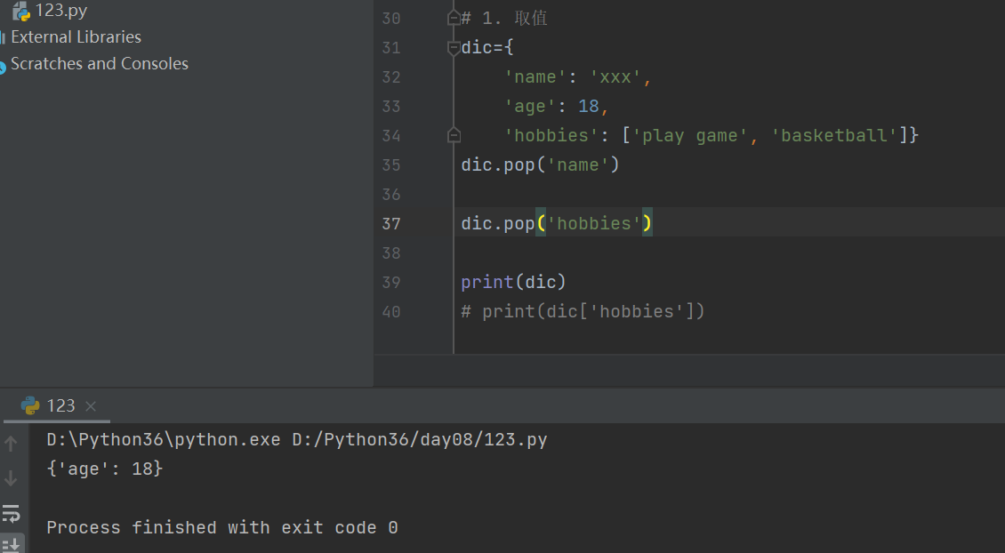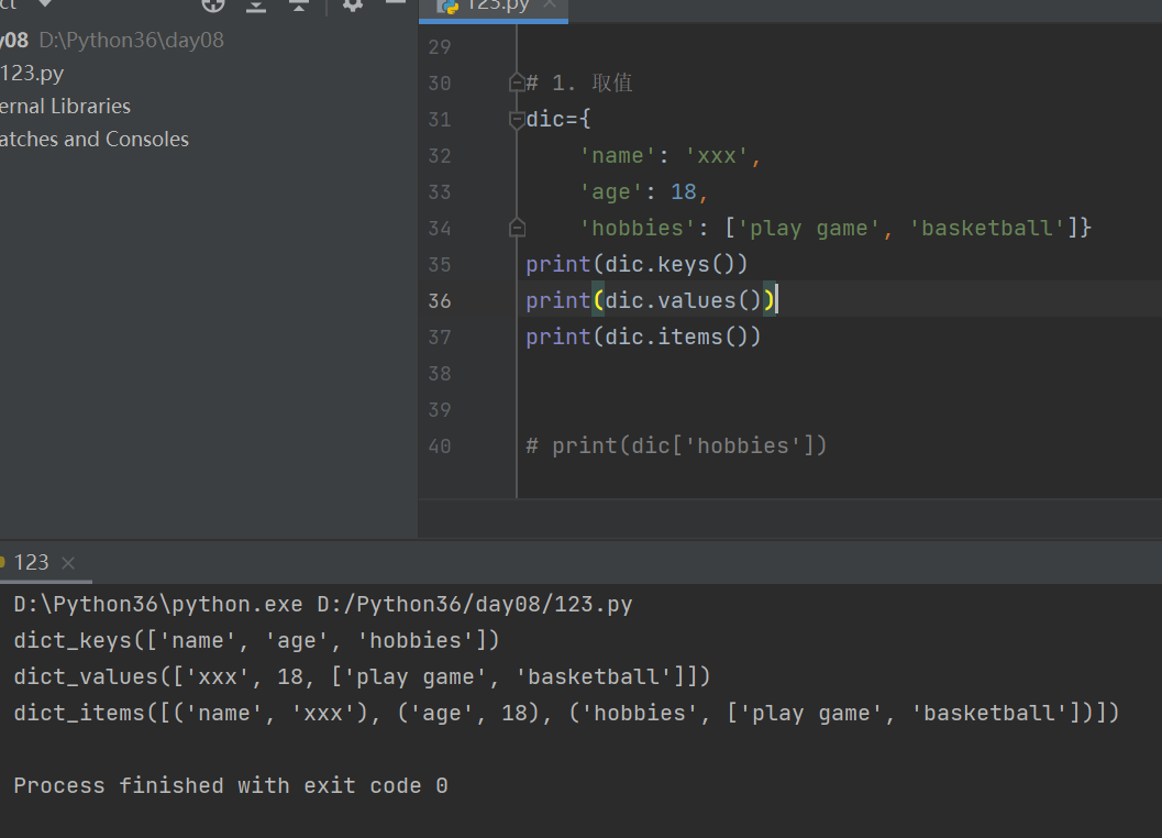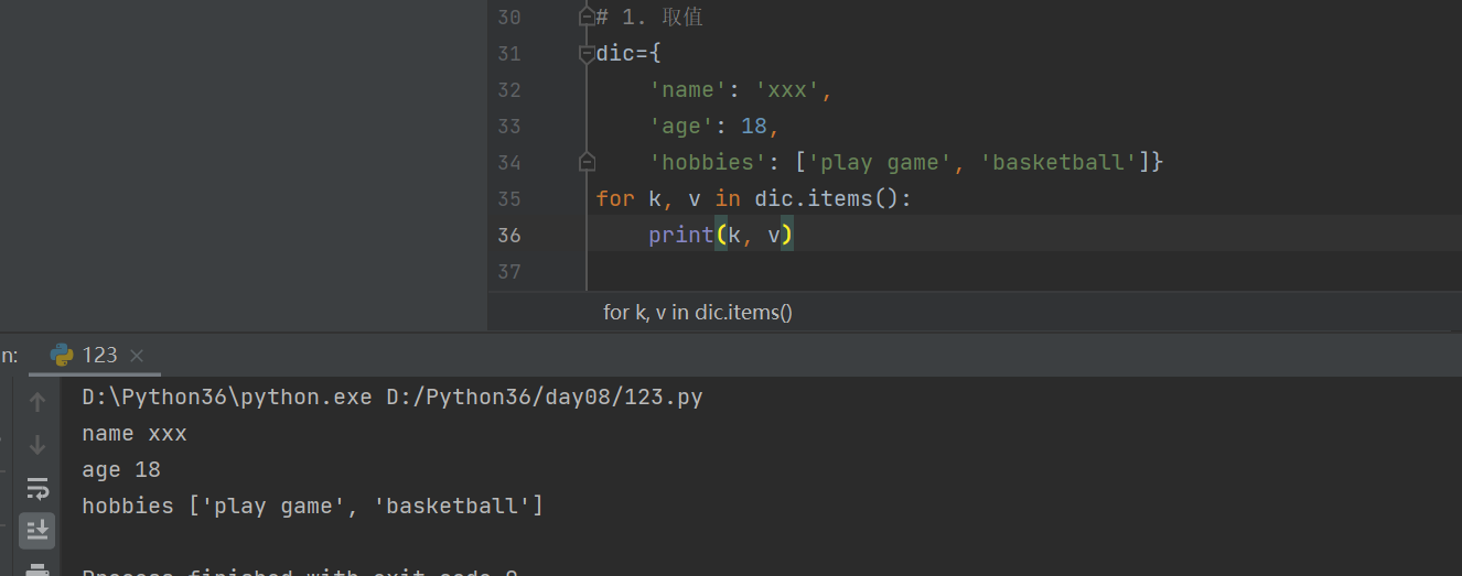 # print(dic.items()) # dict_items([('name', 'xxx'), ('age', 18), ('hobbies', ['play game', 'basketball'])])