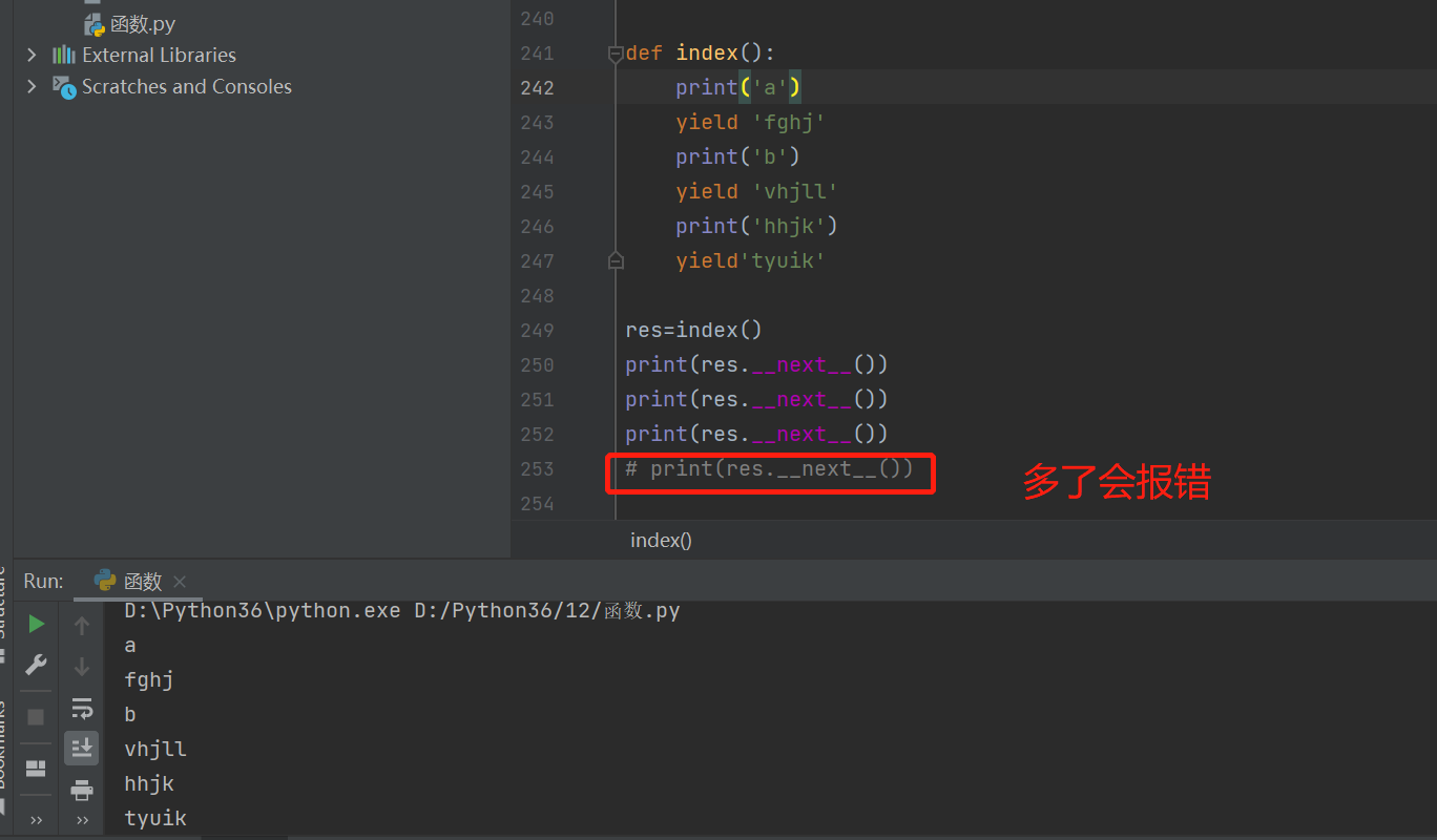 #函数中的yield关键字的玩法:__next__一下,走一个yield,光标就停在了yield,如果再__next__,会从上一次停留的yield位置继续往下走
