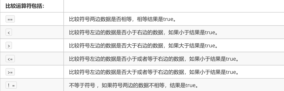 - 比较运算符,是两个数据之间进行比较的运算,运算结果都是布尔值 true 或者 false