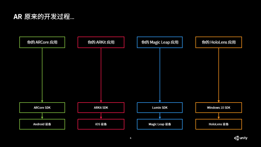 在ARFoundation诞生之前,如果我们需要开发一个多平台的AR应用,会使用 ARCore XR Plugin 开发一个Android设备版本,使用 ARKit XR Plugin 开发一个iOS设备版本。由于底层API的不同,这样我们就需要同时维护多份代码,这无疑增加了我们工作量和开发成本。因此Unity利用其跨平台的优势,开发了一个与平台无关的AR开发工具包,将 ARCore XR Plugin 、ARKit XR Plugin、Magic Leap XR Plugin、Windows XR Plugin 等AR开发工具包,进行了二次封装,统一API,只需要写一份代码就可以发布到多平台,它会根据我们发布的平台自主选择底层SDK。Unity将这个AR开发工具包命名为“ARFoundation”。
