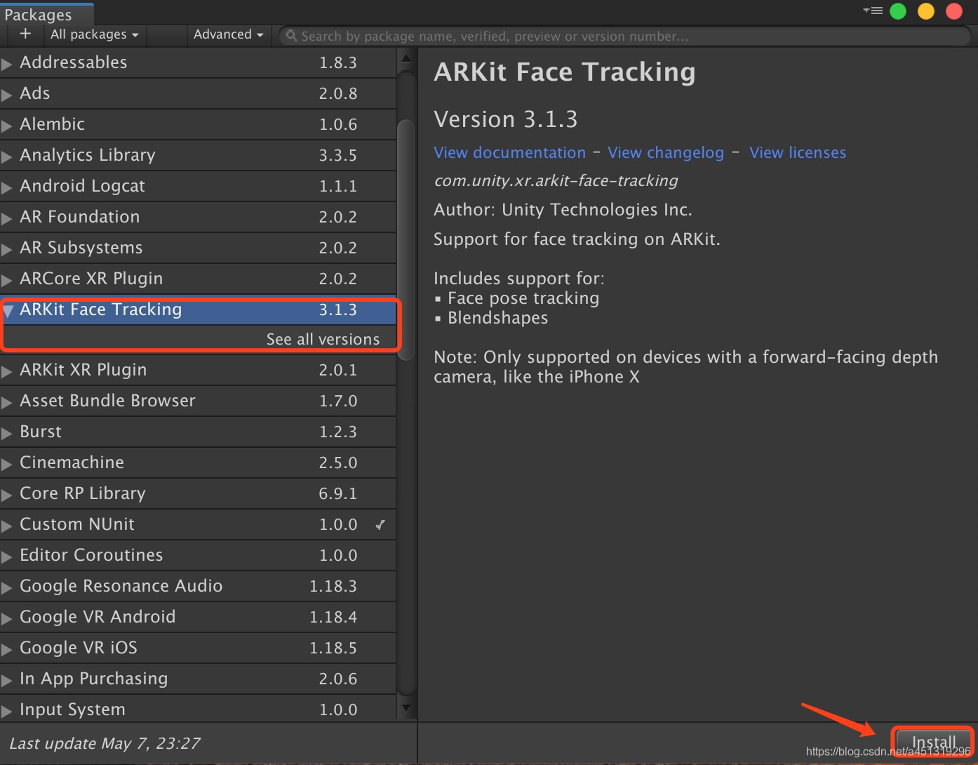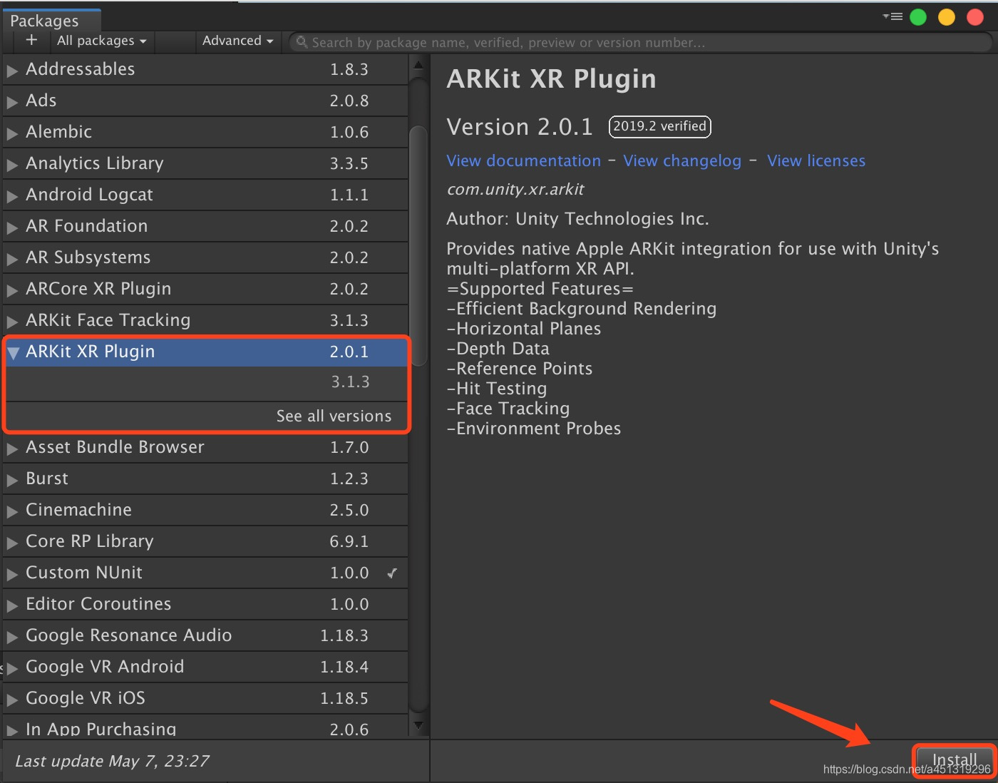 4.Packages->ARKit XR Plugin->Install(可以根据自己的需求选择ARKit的版本)