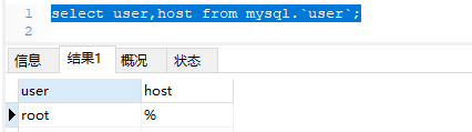 # 在某个数据库下操作 # 允许任何人访问数据库,第一个root:用户名,第二个root:密码 GRANT ALL PRIVILEGES ON *.* TO 'root'@'%' IDENTIFIED BY 'root' with grant OPTION; # 重新加载用户权限 FLUSH PRIVILEGES; # 在mysql库下查看结果 select user,host from mysql.`user`;