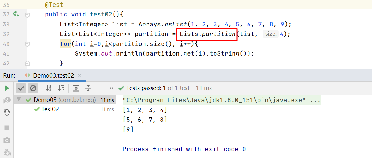 @Test public void test02(){ List<Integer> list = Arrays.asList(1, 2, 3, 4, 5, 6, 7, 8, 9); int totalPage = 0; int pageSize = 5; int size = list.size(); if (size % pageSize == 0) { totalPage = size / pageSize; } else { totalPage = (size / pageSize) + 1; } for(int i=1;i<=totalPage; i++){ List<Integer> curentPage = null; if(i==totalPage){ curentPage = list.subList((i-1)*pageSize, size); }else{ curentPage = list.subList((i-1)*pageSize, i*pageSize); } System.out.println(curentPage.toString()); } }
