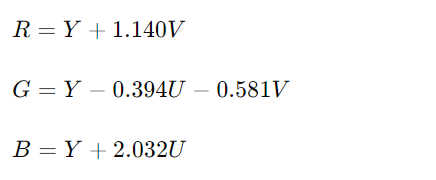 U (Chrominance): 色度分量,表示蓝色与亮度的差异。