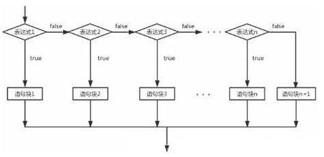 1 if(布尔表达式1){ 2 //如果表达式1为true将执行的语句 3 }else if(布尔表达式2){ 4 //如果表达式2为true将执行的语句 5 }else if(布尔表达式3){ 6 //如果表达式3为true将执行的语句 7 }else { 8 //如果以上布尔表达式都不为true执行语句 9 }