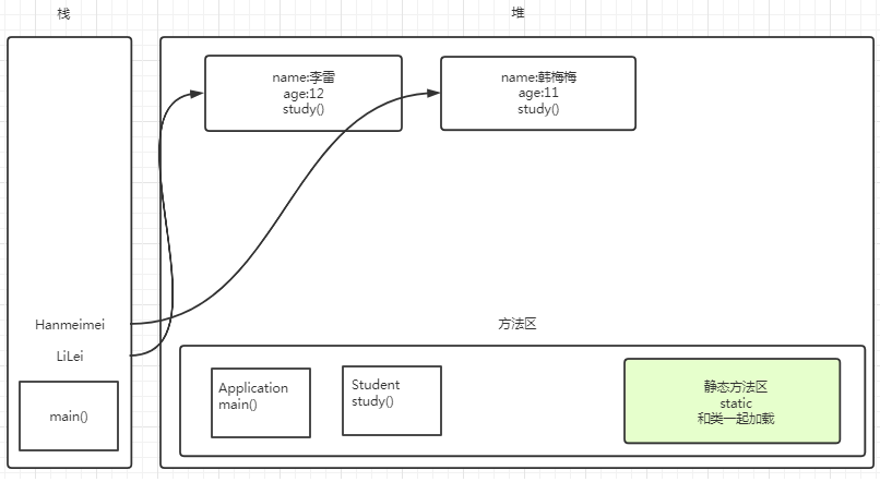 1 package oop; 2 3 public class Application { 4 public static void main(String[] args) { 5 Student LiLei = new Student(); 6 7 //默认值 8 System.out.println(LiLei.name); 9 System.out.println(LiLei.age); 10 LiLei.study(); 11 12 LiLei.name = "李雷"; 13 LiLei.age =12; 14 15 System.out.println(LiLei.name); 16 System.out.println(LiLei.age); 17 LiLei.study(); 18 19 Student Hanmeimei = new Student(); 20 21 Hanmeimei.name = "韩梅梅"; 22 Hanmeimei.age = 11; 23 24 } 25 } 26 package oop; 27 28 public class Student { 29 //属性 30 String name; 31 int age; 32 33 //方法 34 public void study(){ 35 System.out.println(this.name+"正在学习..."); 36 } 37 }