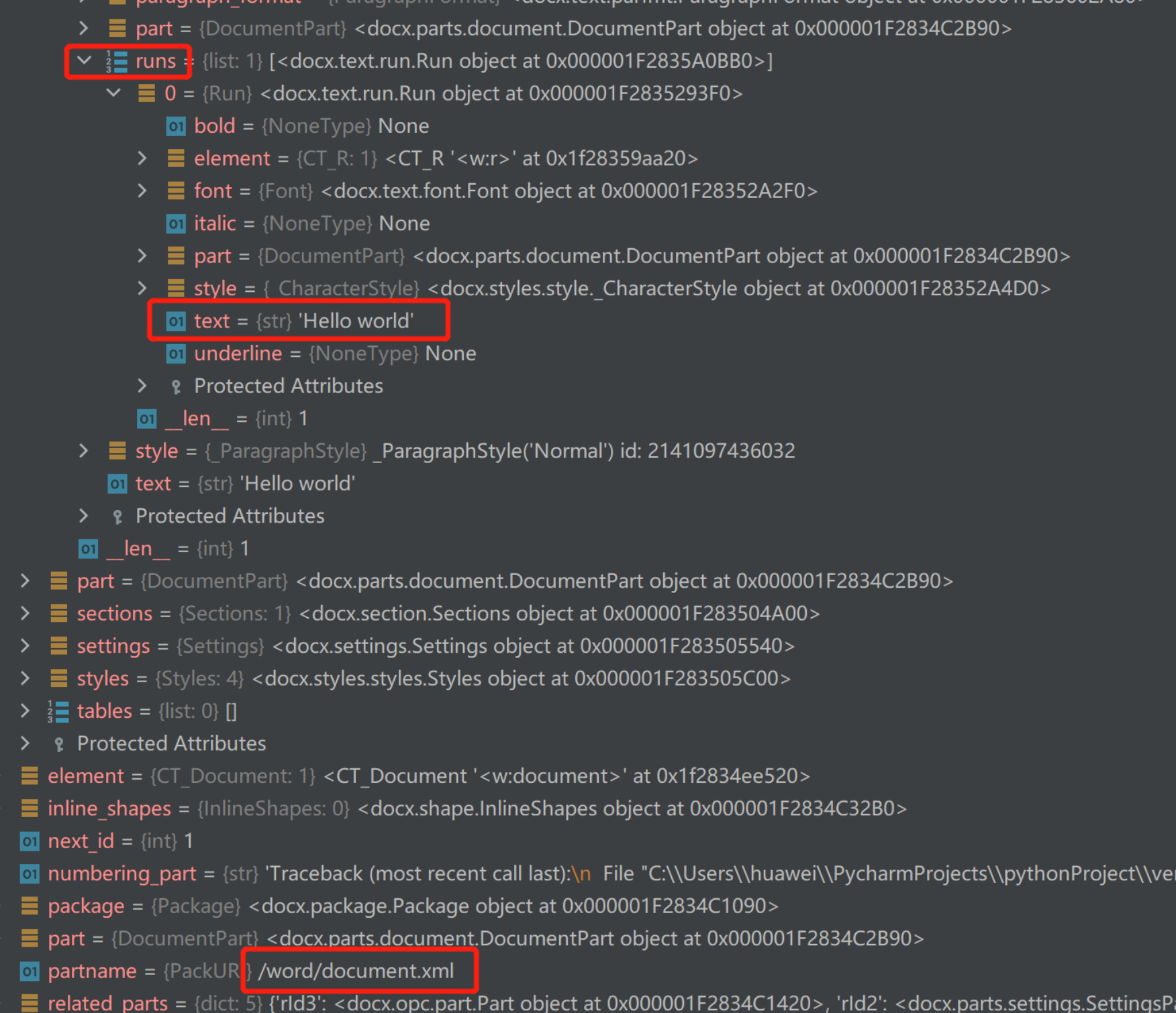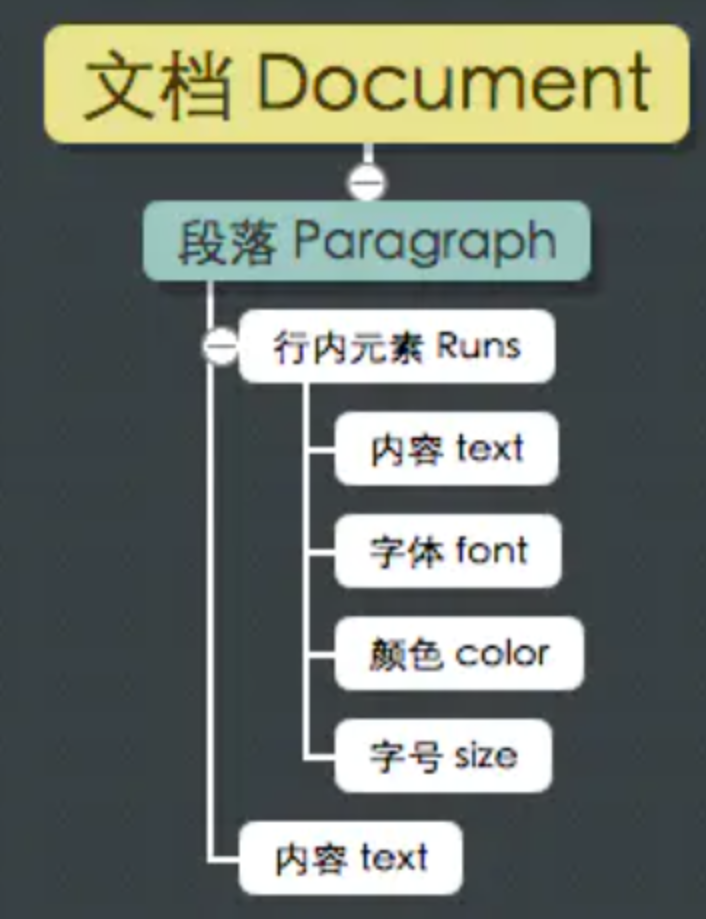 整篇文档是一个Document,将正文分成若干个段落Paragraph(以回车算,一个回车一个段落,表格不算),每个段落Paragraph再划分为若干个run对象。每个run对象内的文本样式都是一致的,也就是说,在从docx文件生成文档对象时,python-docx会根据样式的变化来将文本切分为一个个的Run对象。
