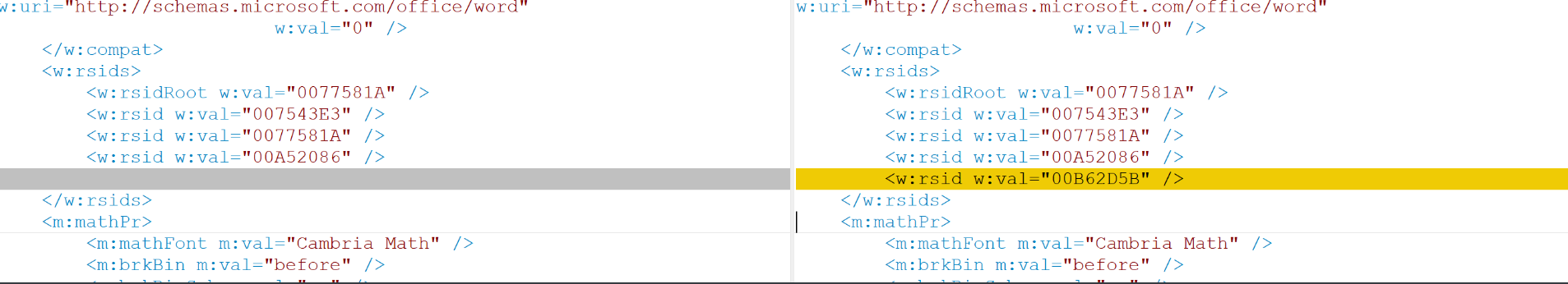 在settings.xml文件中多了一个rsid,文档修改保存一次会产生一个新的ID。