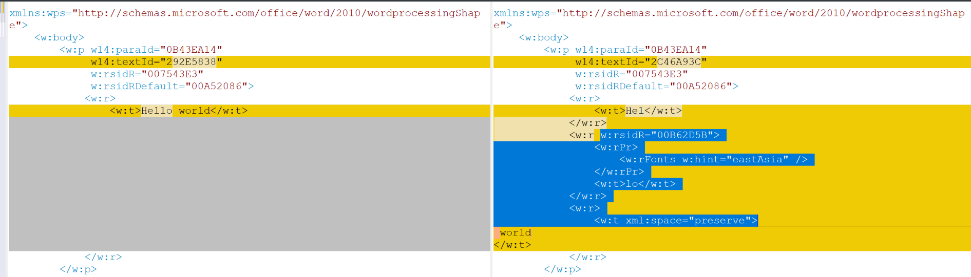 基于以上的理解,在测试的时候发现了一个问题。在一个word文档中编辑一段文字,比如“Hello world”,然后将“hello”的后两个字母去掉“lo”,再将这两个字母加上,最终的结果还是“Hello world”,格式完全没有变过。按照上面的的理解,这段文字应该是一个Paragraph,一个run。