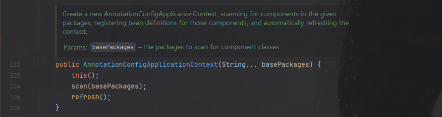 首先从main方法开始,点击进入AnnotationConfigApplicationContext类,主要关注refresh方法,实例化Bean和注入依赖的操作都是在该方法中实现: