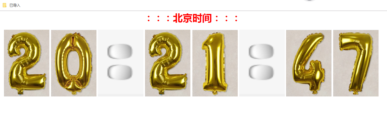 1 <!DOCTYPE html> 2 <html lang="zh"> 3 <head> 4 <meta charset="UTF-8"> 5 <meta http-equiv="X-UA-Compatible" content="IE=edge"> 6 <meta name="viewport" content="width=device-width, initial-scale=1.0"> 7 <title>retunTime</title> 8 </head> 9 <body> 10 <h1>:::北京时间:::</h1> 11 <div class="time"> 12 <div id="hour"> 13 <img src=""> 14 <img src=""> 15 <img src="imgs/dot.png"> 16 17 </div> 18 <div id="minute"> 19 <img src=""> 20 <img src=""> 21 <img src="imgs/dot.png"> 22 </div> 23 24 <div id="second"> 25 <img src=""> 26 <img src=""> 27 28 </div> 29 </div> 30 </body> 31 </html>