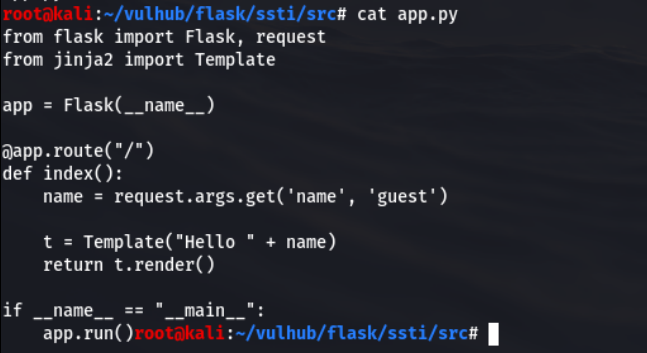 重点在于t = Template("Hello" + name)这一行,name可以通过get方法获得且没有任何过滤,个人认为和SQL注入很像
