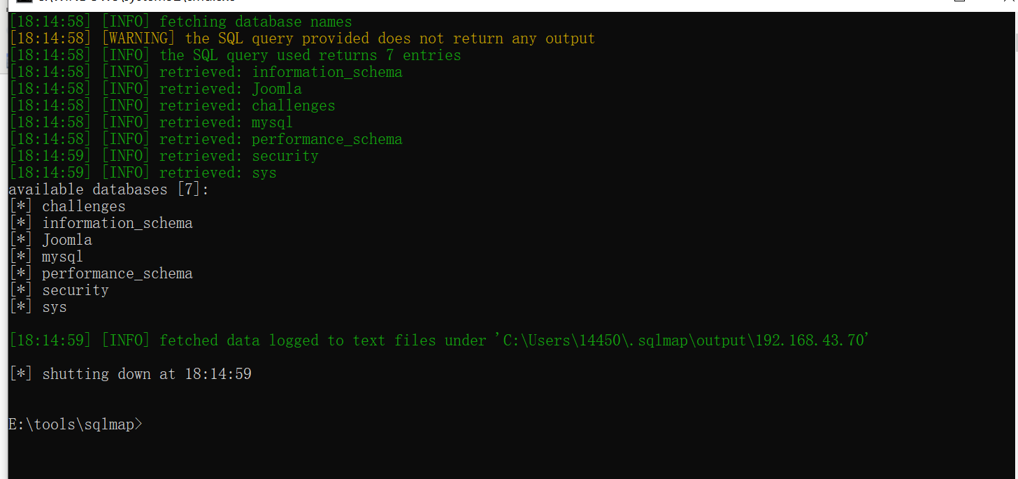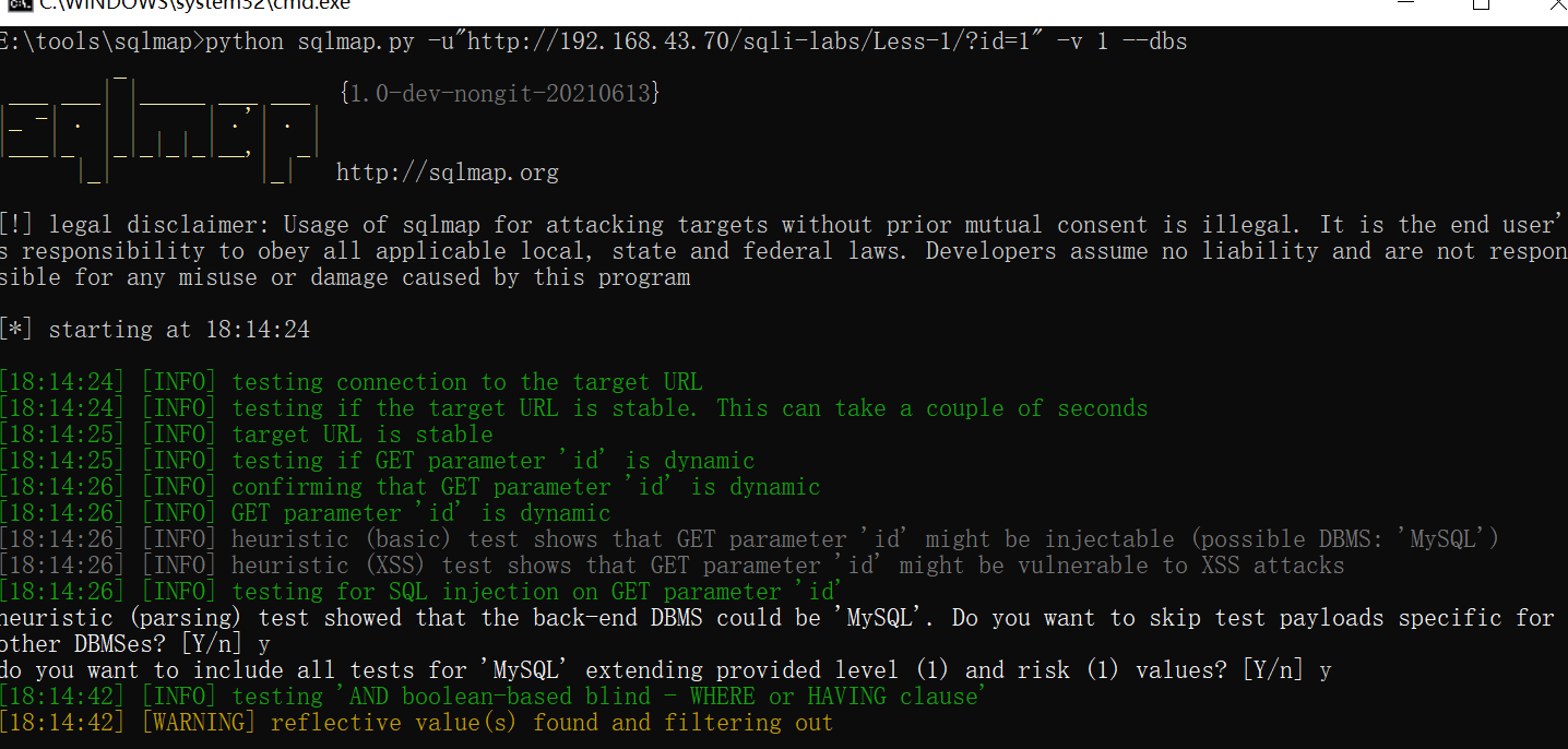 1、python sqlmap.py -u "http://192.168.43.70/sqli-labs/Less-1/?id=1" -v 1 --dbs 爆库