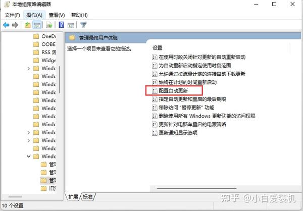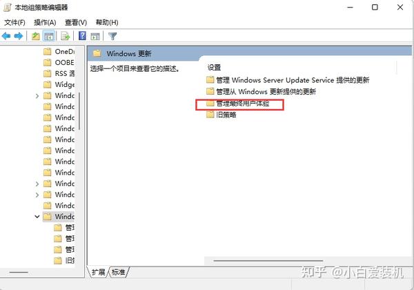 3、在Windows更新中找到管理最终用户体验,在右侧双击“配置自动更新”,然后选择“已禁用;