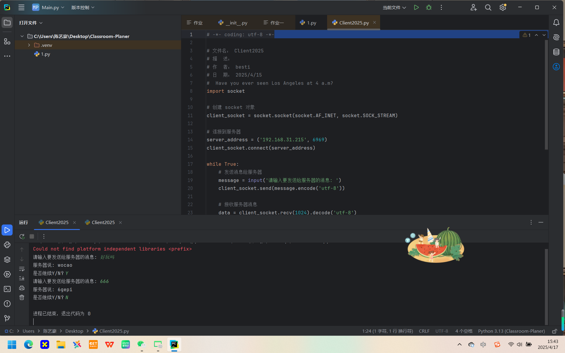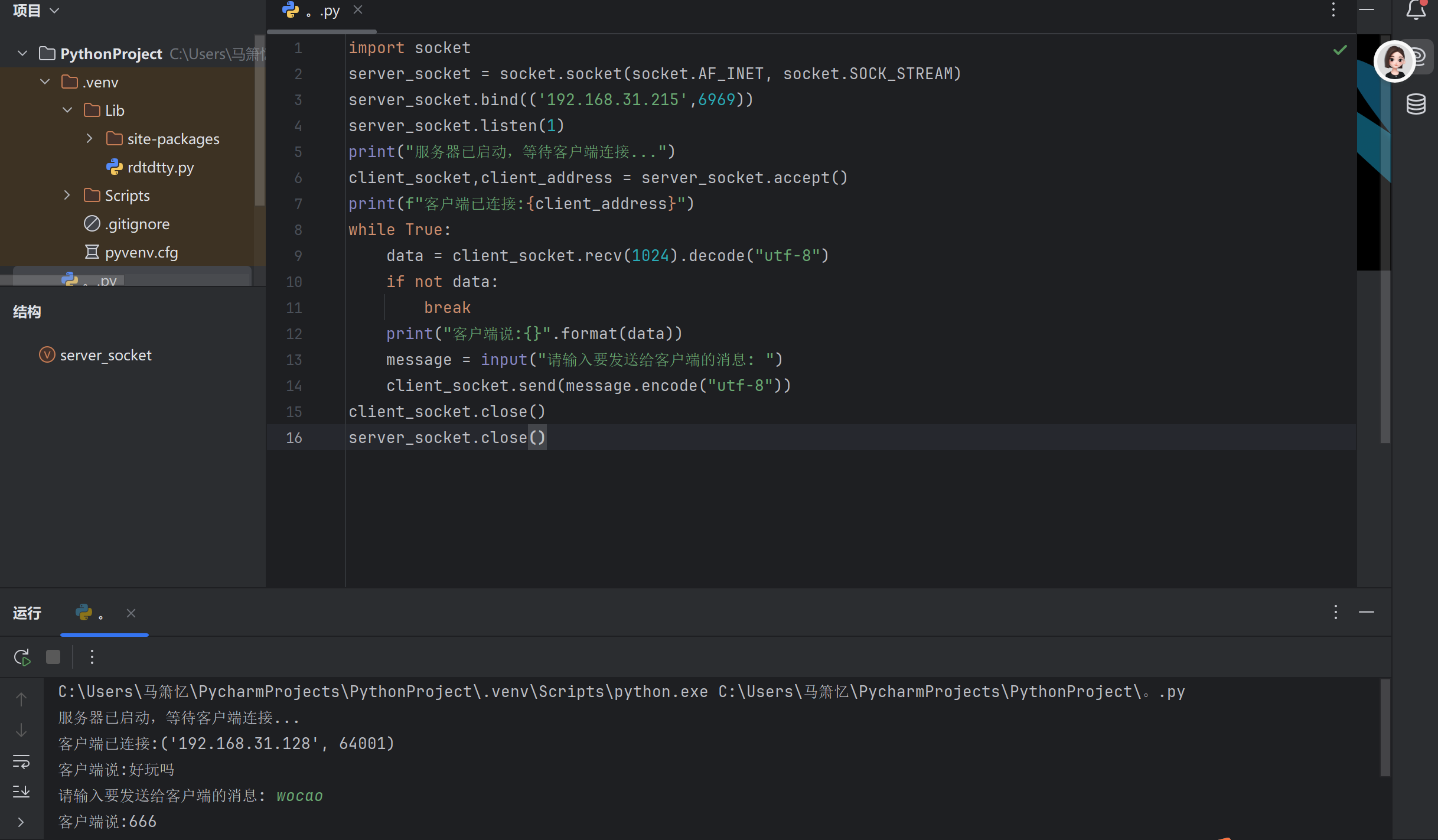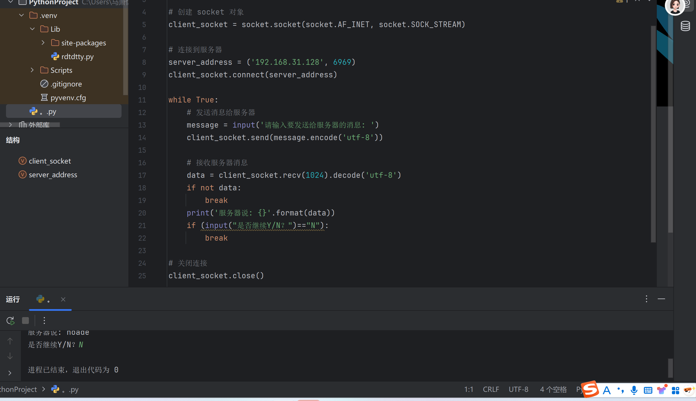 1.创建服务端和客户端,选择一个通信端口,用Python语言编程实现通信演示程序;