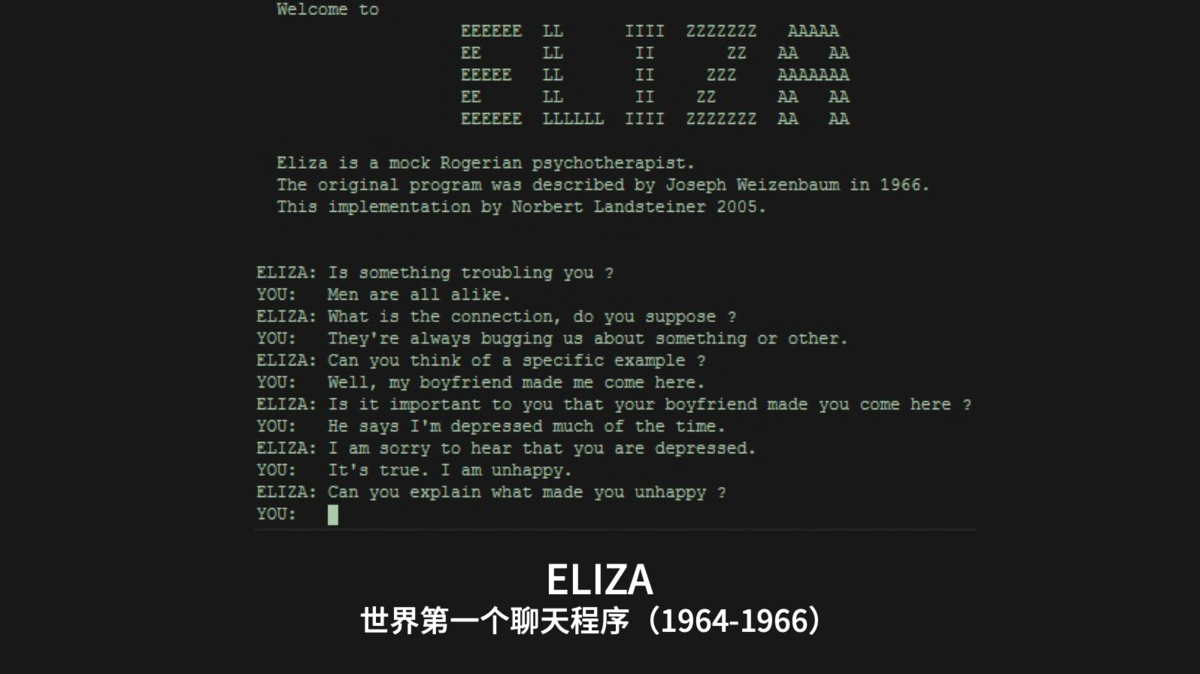 1965年:计算机科学家兼教授Joseph Weizenbaum开发了ELIZA,这是一个交互式计算机程序,可以用英语在功能上与英语交谈。Weizenbaum的目标是证明人工智能思维与人类思维之间的沟通是“肤浅的”。 这也是第一个尝试通过图灵测试的软件程序,“对话就是模式匹配”,这是计算机自然语言对话技术的开端。