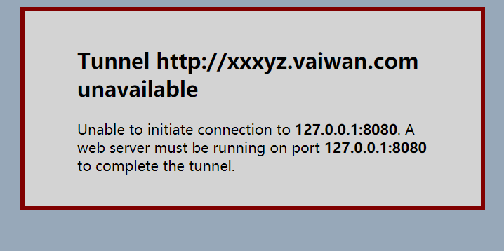 这里注意我们只用成功穿透后的域名http://xxxyz.vaiwan.com访问时,它是会映射到127.0.0.1:xxxx端口的,所以要想通过这个域名访问自己的网站, 需要将自己的网页通过web服务器挂载到127.0.0.1:xxxx上.