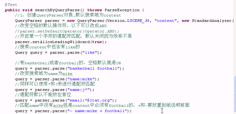 QueryParser parser = new QueryParser(Version.LUCENE_35 ,"content" ,new StandardAnalyzer(Version.LUCENE_35 ));