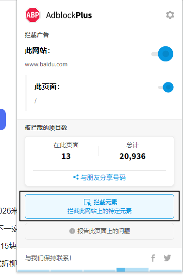 安装好adblock plus后,我们在右上角选择开启,并且点击拦截此网站上的特定元素: