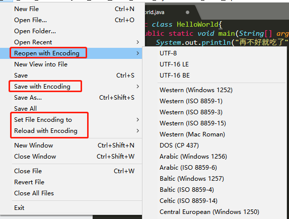 然后想要改变编码保存,点击File,尝试下面几项。选UTF-8。问题解决。