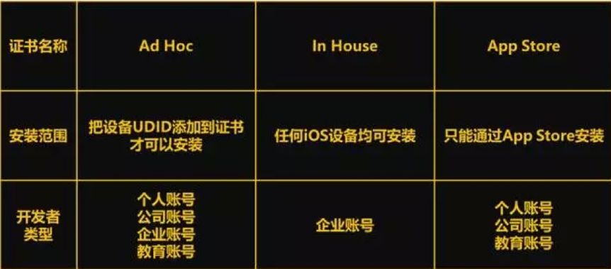 由以上介绍可知,不同的苹果开发者账号对应使用不同的证书类型,而安装不同的包需要不同的证书签名,因为苹果的安全策略,通过签名机制保证手机上的每个App都是经过苹果认证的。