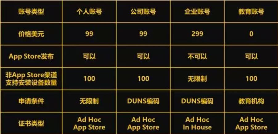 iOS开发APP都需要申请苹果开发者账号,开发者帐号分为:个人开发者账号($99/年)、公司开发者账号($99/年)、企业级开发者账号($299/年);