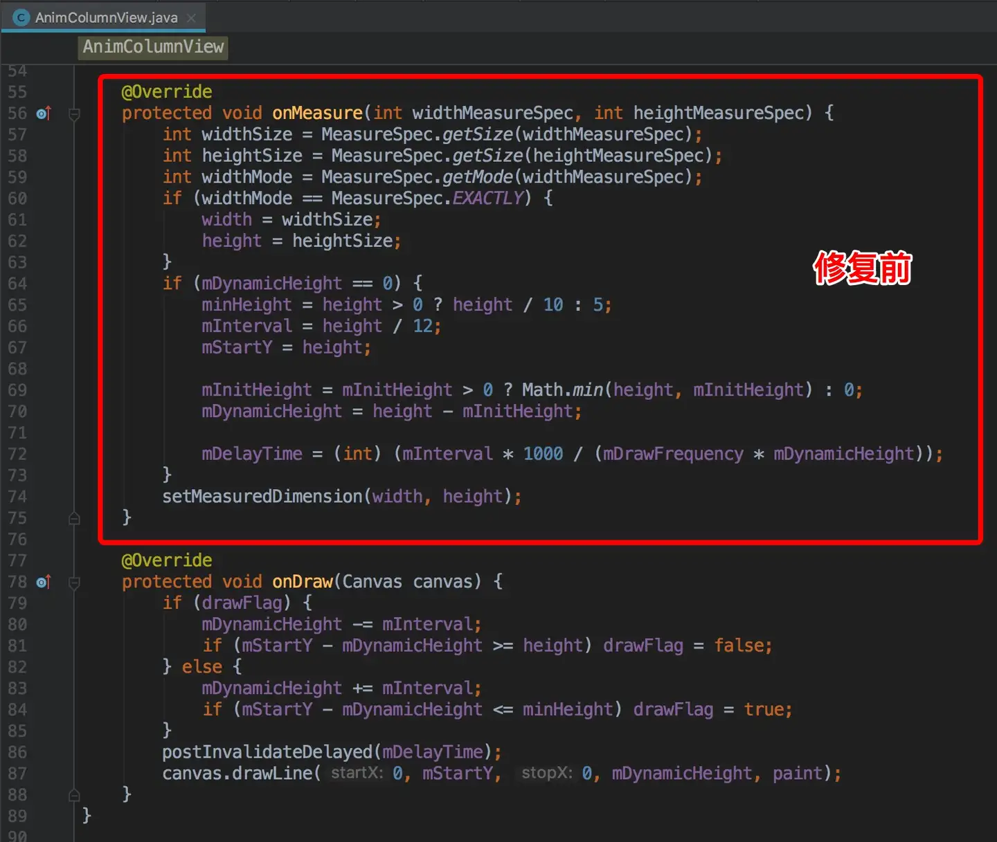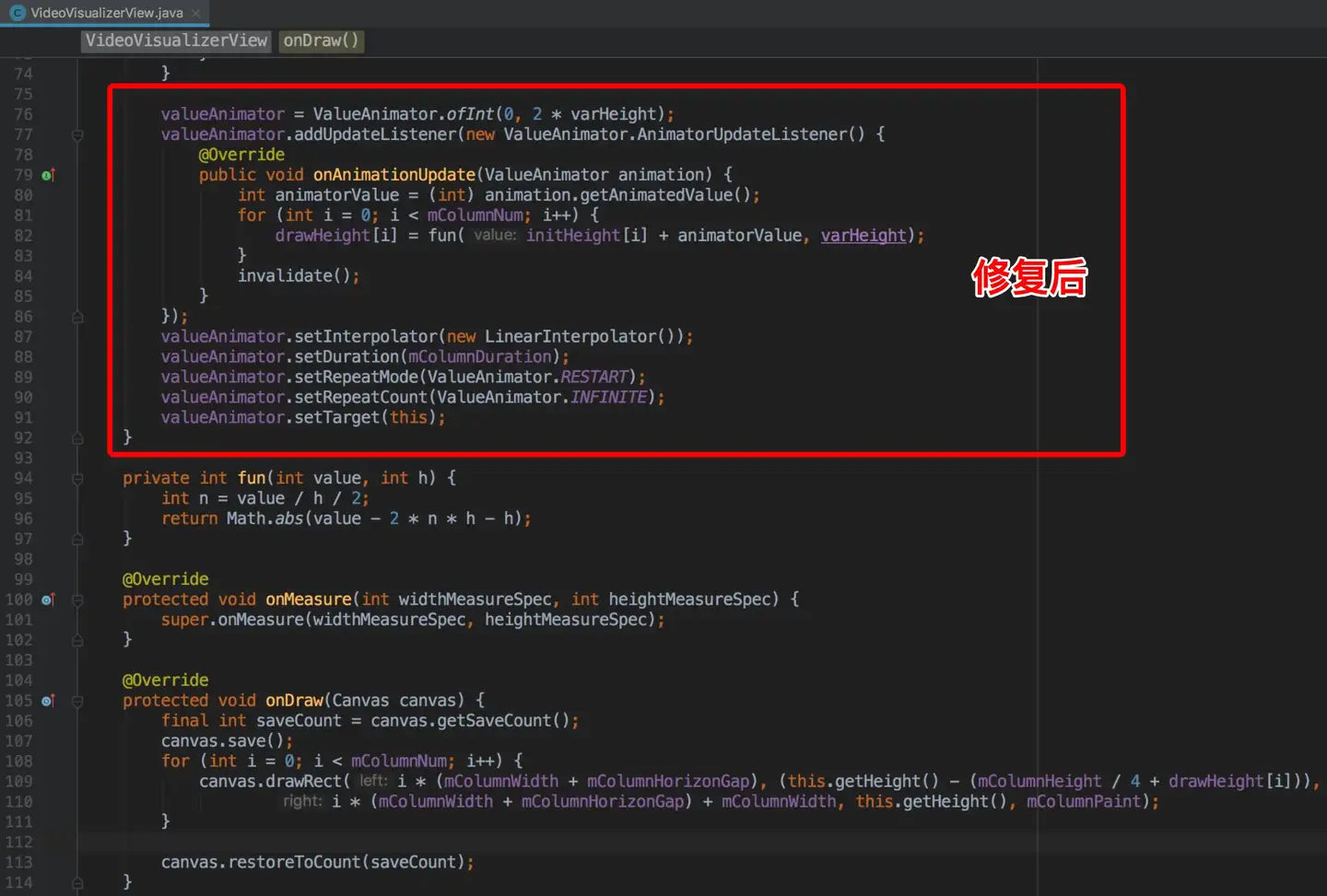 定位到原因之后,开发针对性的进行了修复。动画音符柱状图的实现,之前设计由多个可变化的单柱形View组成,单个柱形View重写了onMeasure & OnDraw方法,从外部柱状图View中初始化单个柱子的高度,然后自动根据一个函数式来变化高度。因为每次都需要层层调用Measure和对应的Layout,所以造成外层控件的多次layout,进而造成CPU占用率增大。修复之后,使用另一种方式实现,只重写了View的OnDraw方法,每次使用Canvas画出所有柱状图,使用ValueAnimator来计算变化柱状图高度,也不再影响父控件的Layout。如下是修复前后的核心代码: