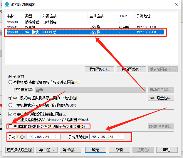 2、点击VMnet8,把“使用本地dhcp服务将ip地址分配给虚拟机”取消勾选。下面的子网ip和子网掩码我还是用的系统自动分配的,这个可以根据个人情况进行设置。