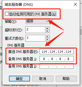 4、把“自动检测可用的DNS服务器”取消勾选,并在下面配置dns服务器 “114.114.114.114” 及“8.8.8.8”这两个是公用的