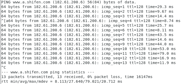 7、测试。输入命令“ping www.baidu.com”,如果能正常通信说明配置完成。