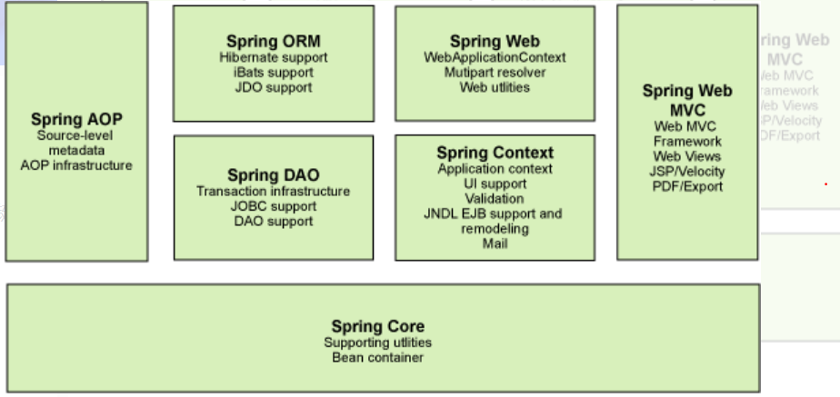 还有其他一些重要的模块,像 AOP,Aspects,Instrumentation,Web 和测试模块,它们的细节如下: