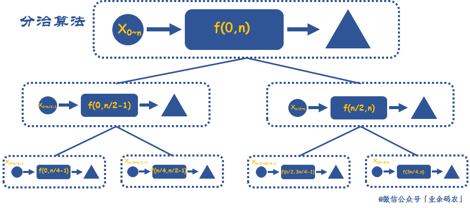 在实际的运用中,分治算法主要包括两个维度的处理,一是自顶向下,将主要问题划分逐层级划分为子问题;二是自底向上,将子问题的解逐层递增融入主问题的求解中。