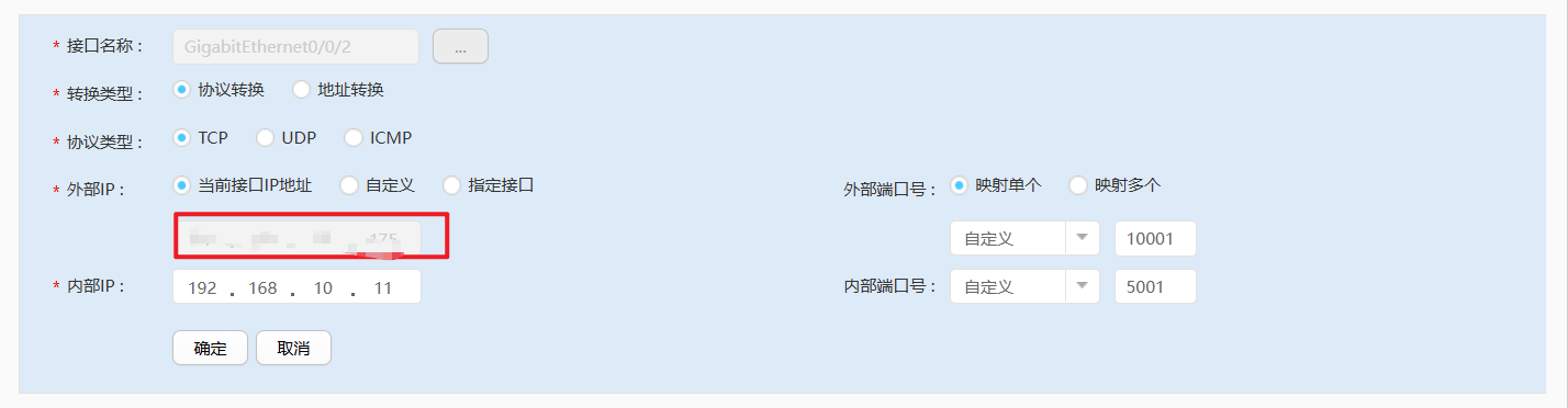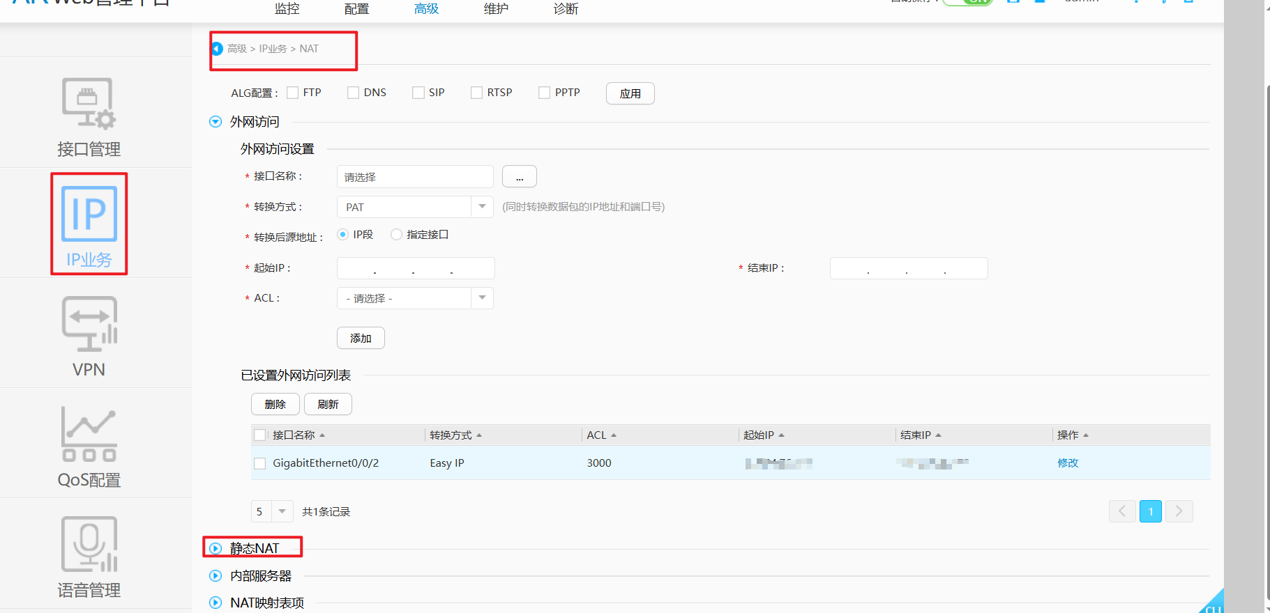 添加一条静态NAT,设置规划好的外部端口和内部端口