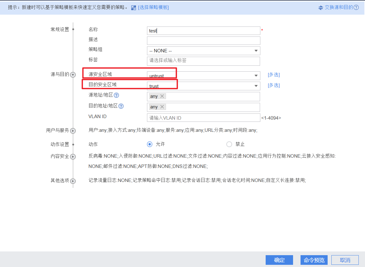 - 猜想防火墙默认将untrust区域至trust区域的流量禁止,所以导致外网无法访问内网服务器