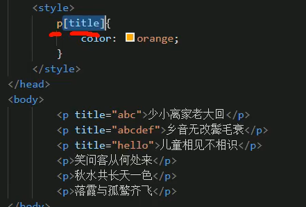 复合选择器, 在P标签中 找到title中 有