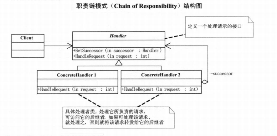 职责链模式:使多个对象都有机会处理请求,从而避免请求的发送者和接收者直接按的耦合关系。将这个对象连城一条链,并沿着这条链传递该请求,直到有一个对象处理它为止。