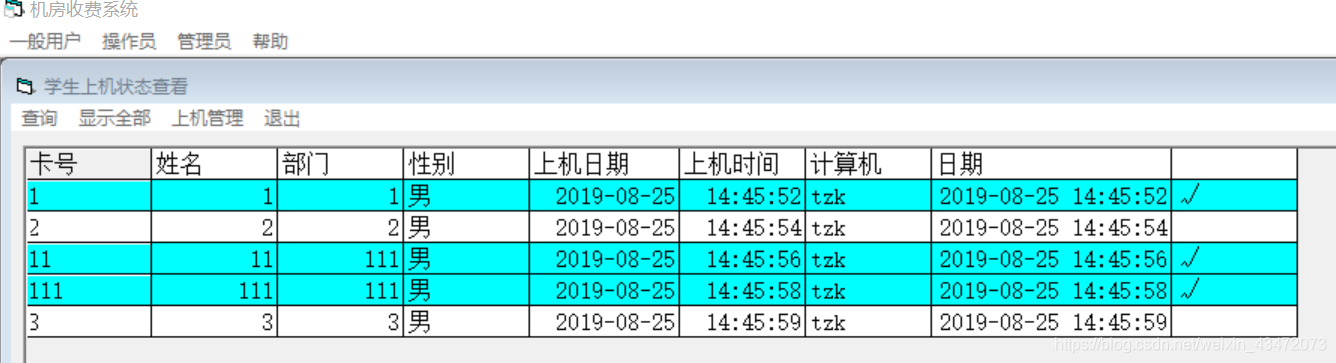 机房收费系统中查看学生上机状态 ,其功能就是查看 正在上机的学生,并将他们下机,下机方式有两种,一种是 全部下机, 另一种是选中下机, 其中选中下机 实现较为困难一点。 因为选中下机 一次 就要更新一次。 会出现一些莫名其妙的问题。