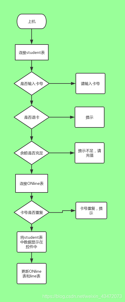 1.判断卡号是否注册,退卡,余额是否大于最小上机金额时,用到了student 表。