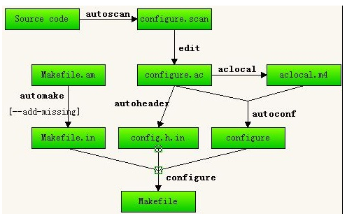autoconf:将configure.ac中的宏展开,生成configure脚本。这个过程可能要用到aclocal.m4中定义的宏。