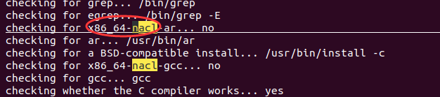 在进行./configure --host=x86_64-nacl --target=x86_64-nacl时,会检查对应的gcc, ar等工具是否存在