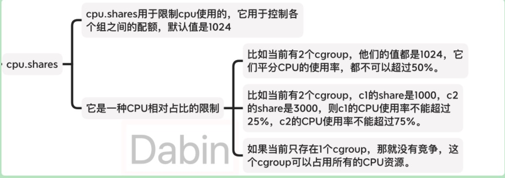 ,是系统内多个 cgroup 的进程同时运行时他们的CPU使用上限占比,比如只有两个cgroup: [cgroup1.shares: 1024, cgroup2.shares: 512],那 cgroup1 可以用 2/3 的 CPU。 - quota,对应文件