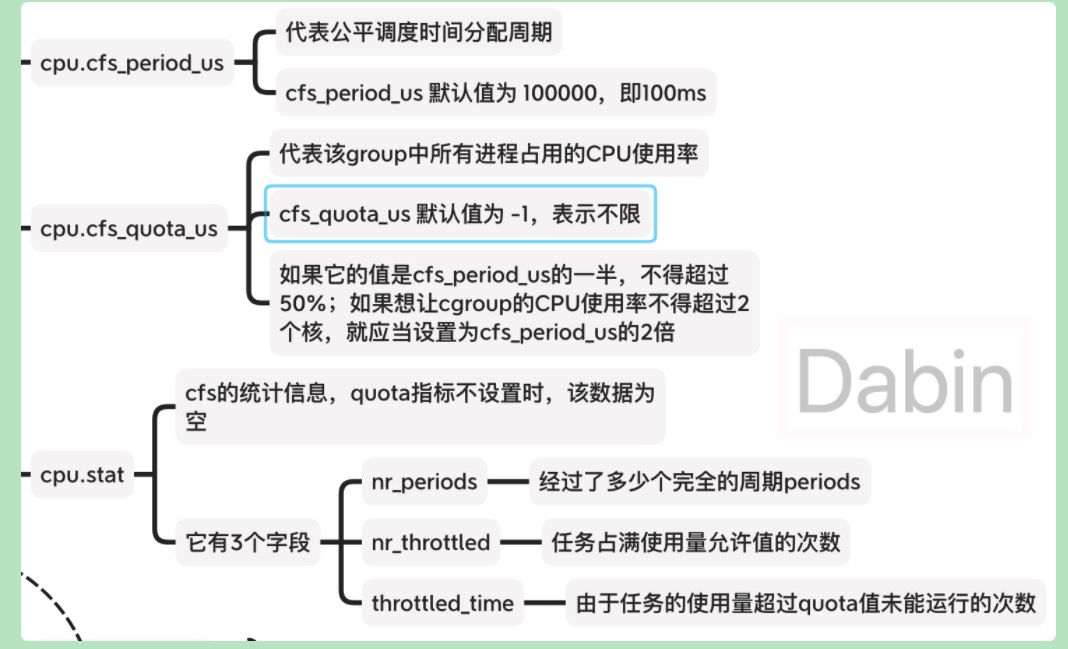 假设 {cpu.cfs_quota_us: 200000, cpu.cfs_period_us: 100000},意思是每 100ms 可以使用 200ms CPU 时间,相当于可以使用两个核。quota 为 -1 的时候表示无限制。