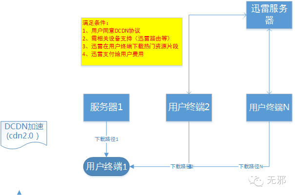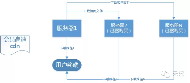 通过购买服务器,迅雷在用户下载的同时,把文件快速下载到迅雷服务器(强大的带宽和网速),用户再从距离最近的迅雷服务器进行下载(从迅雷服务器到迅雷客户端的下载速度极快)。