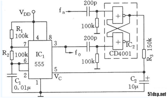 如图所示,由555和R1、R2、C1组成可控的多谐振荡器,它的振荡频率除与RC时间常数有关外,还可由控制端的直流电平来调节。而该直流电平由基准频率f。和555输出的振荡波频率fo=Nfn共同锁定的RS触发器输出的方波,经低通滤波后产生。CD4001的两个或非门电路组成RS触发器,RS触发器在锁定情况下,输出的占空比不变,因而滤波后的直流电平不变。若555的振荡频率f0向高漂移(或fn下降),则占空比加大,直流控制电平会相应增加,会使频率下降;反之亦然。