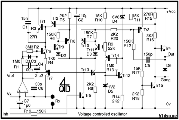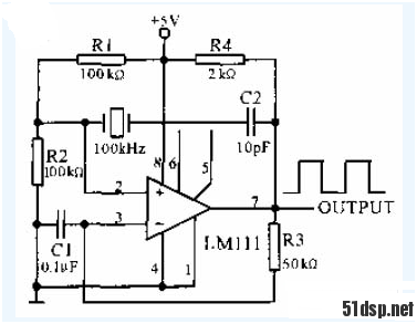 石英晶体矩形波振荡器电路主要用于比较新颖的数字系统的时钟脉冲发生器。该电路的石英晶体处于谐振状态时传输量最大,这时便按晶体的谐振荡率振荡。由于LM111的高输出阻抗与C2的隔离作用,使得石英晶体的负载非常轻。振荡频率的稳定度极高。该电路右获得100KHz的矩形波输出。