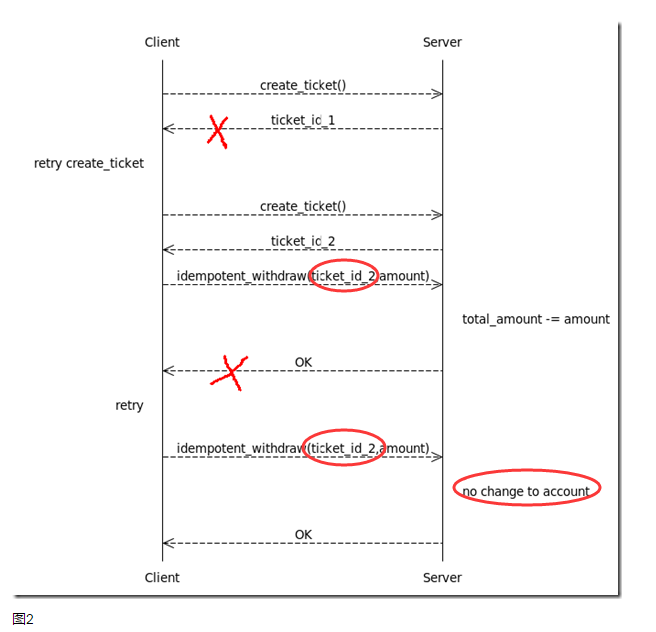虽然create_ticket不是幂等的,但在这种设计下,它对系统状态的影响可以忽略,加上idempotent_withdraw是幂等的,所以任何一步由于网络等原因失败或超时,客户端都可以重试,直到获得结果。如图2所示: