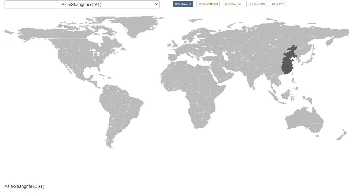 width:设置地图的宽度。height:设置地图的高度。defaultCss:如果设置为true则不需要引入css。hoverColor:鼠标HOVER时显示的颜色。selectedColor:设置选择的时区的颜色。mapColor:设置地图的颜色。quickLink:设置选择时区的快捷方式。selectBox:设置为true是显示选择时区的下拉框。showHoverText:设置为true是显示鼠标hover时区时的文字。mapHover:默认只会高亮显示鼠标当前所在位置的多边形区域。可选值有:timezone, country, zonename。"timezone":地图上所有相同时区的区域都会被高亮。"country":地图上所有相同国家代码的区域都会被高亮。"zonename":地图上所有相同时区名称的区域都会被高亮。